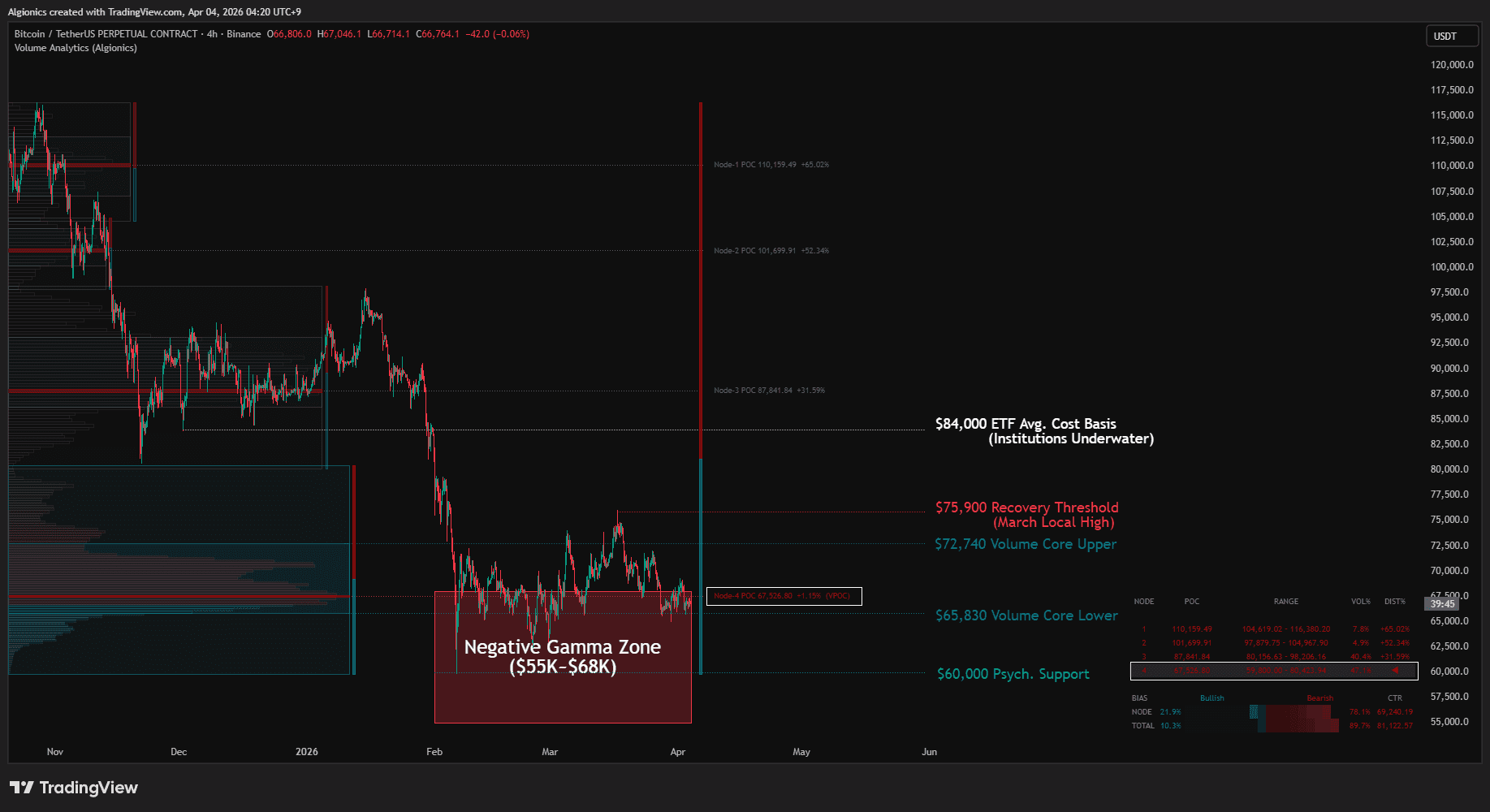 The $67,000 level has acted as a strong support base throughout 2026, with every dip below it being quickly reclaimed. A sustained 3-day close below this level, combined with weakening ETF and whale data, could trigger the next leg down.