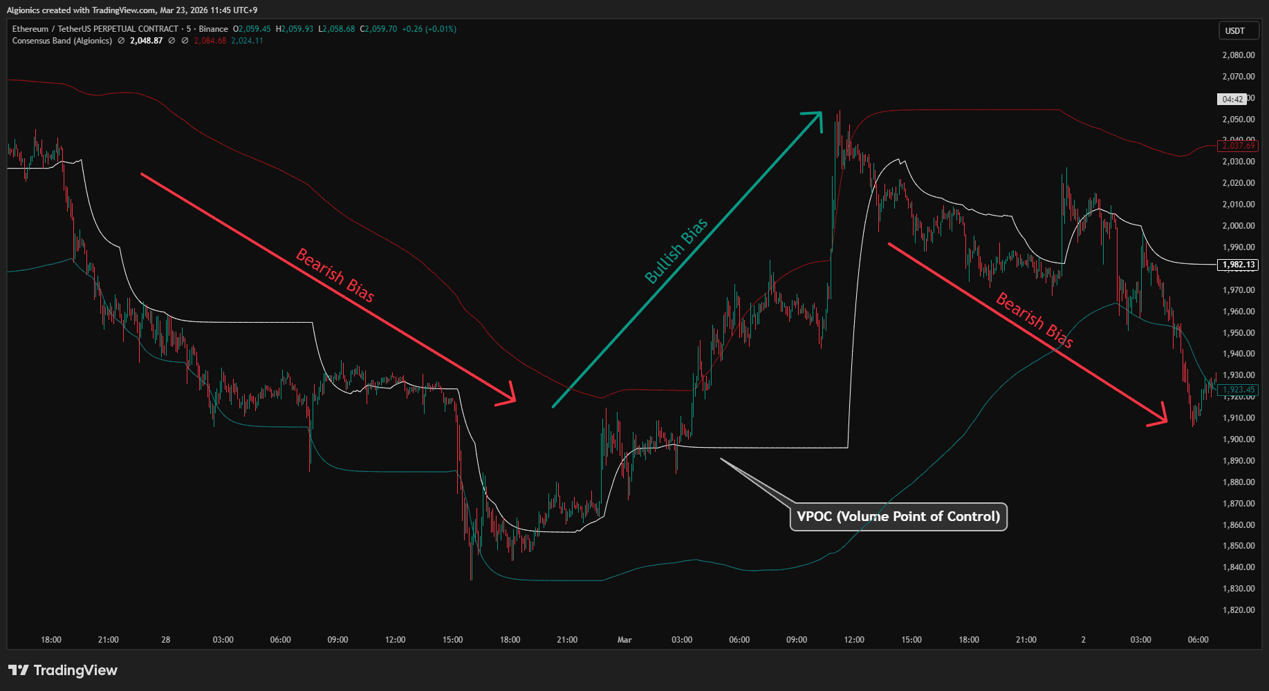 Consensus Band builds every level from real volume distribution across 28 spectral layers. VPOC is where volume peaked. Consensus Area is where the market concentrated. Boundary Band is where structure ends. Nothing is fixed. Everything adapts.