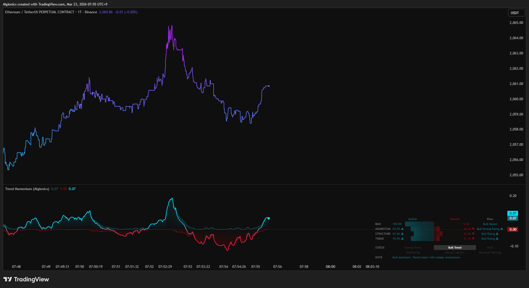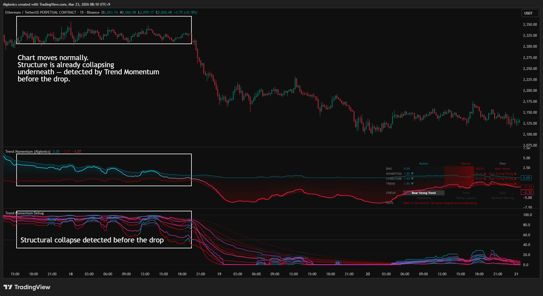 Trend Momentum splits directional energy into two live forces across 28 independent layers.