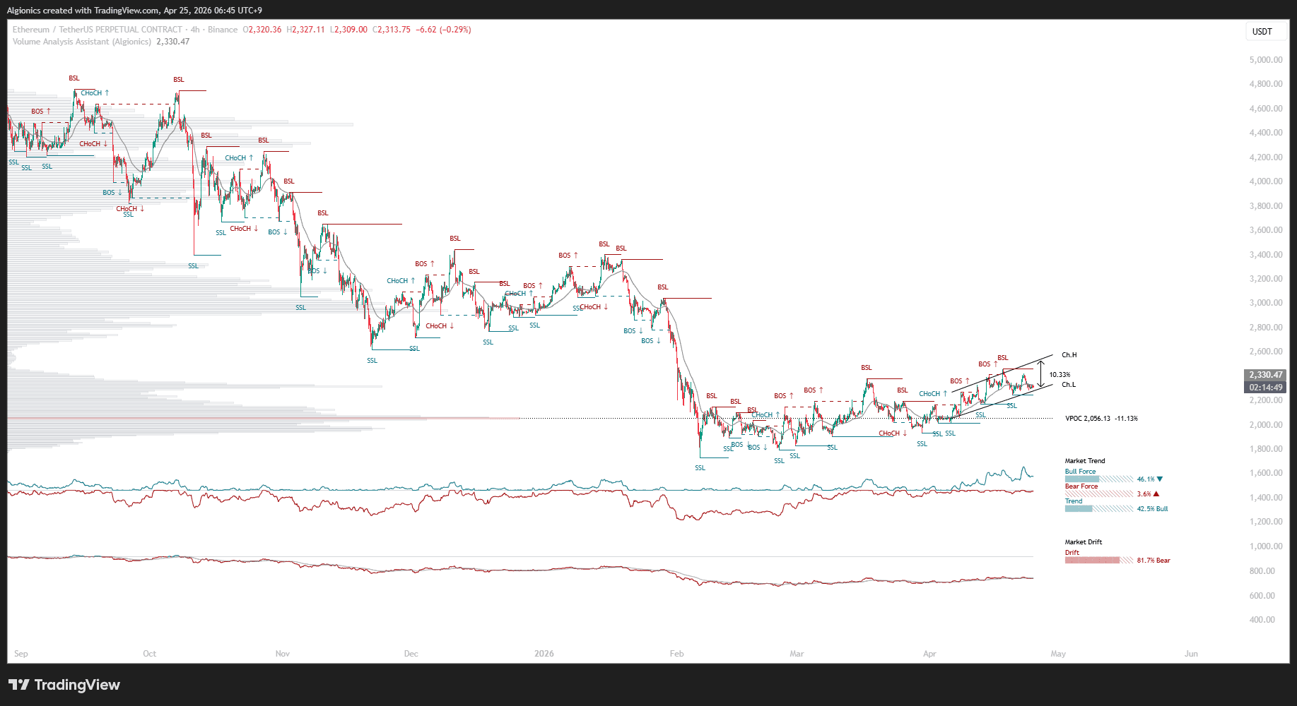 Bull force and bear force, drift direction, structural shifts. All expressed as numbers, updated every bar. When the break of structure happens, you see it named and flagged in real time, not three bars later.
